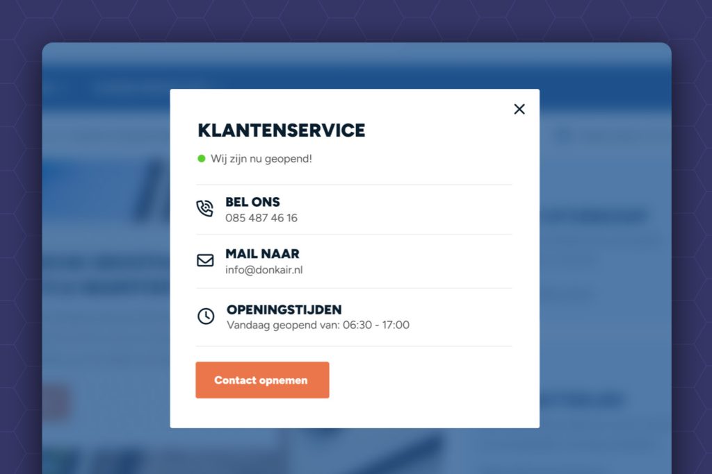 Via een popup krijgt de klant direct inzicht in alle contactmogelijkheden, zoals bellen en e-mailen, evenals de openingstijden. Tijdens feestdagen wordt bovendien expliciet vermeld wanneer de klantenservice gesloten is.
